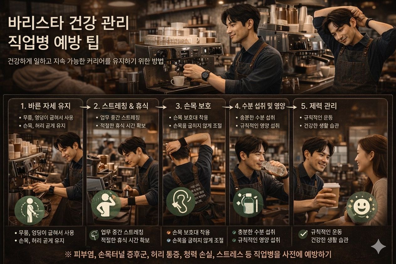 바리스타건강관리, 직업병예방, 손목터널증후군, 바리스타스트레칭, 하지정맥류예방, 카페인조절, 바리스타신발, 작업환경개선, 건강한바리스타, 커피인생