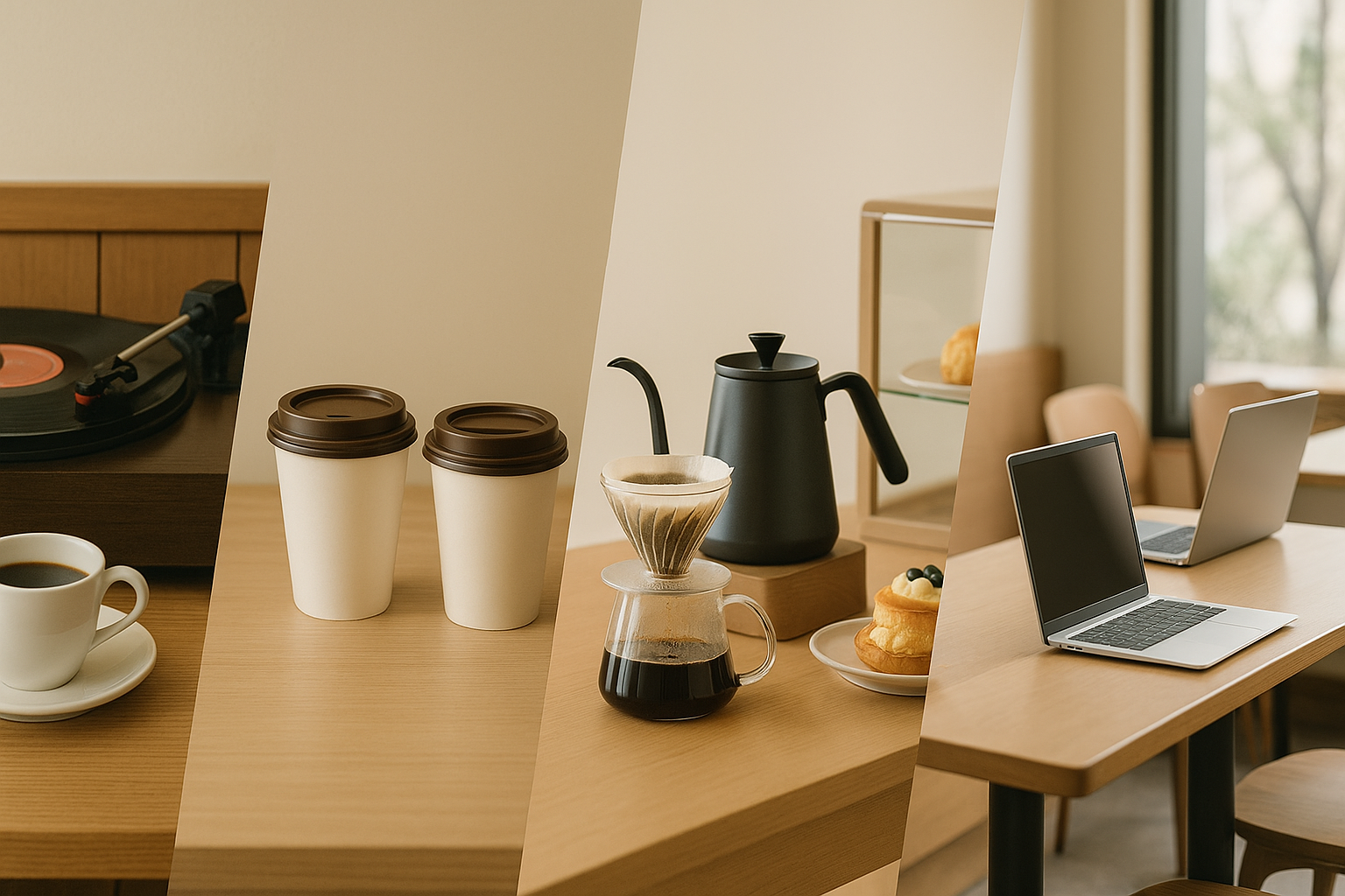 로컬산 원재료(콤부차, 전통차 기반 시그니처), 디카페인/오트밀크 선택지 확대, 제로 웨이스트 지향, 스터디·워크 존 분리 운영, 지역 소도시의 로컬 로스터리 부상 등이 눈에 띕니다.